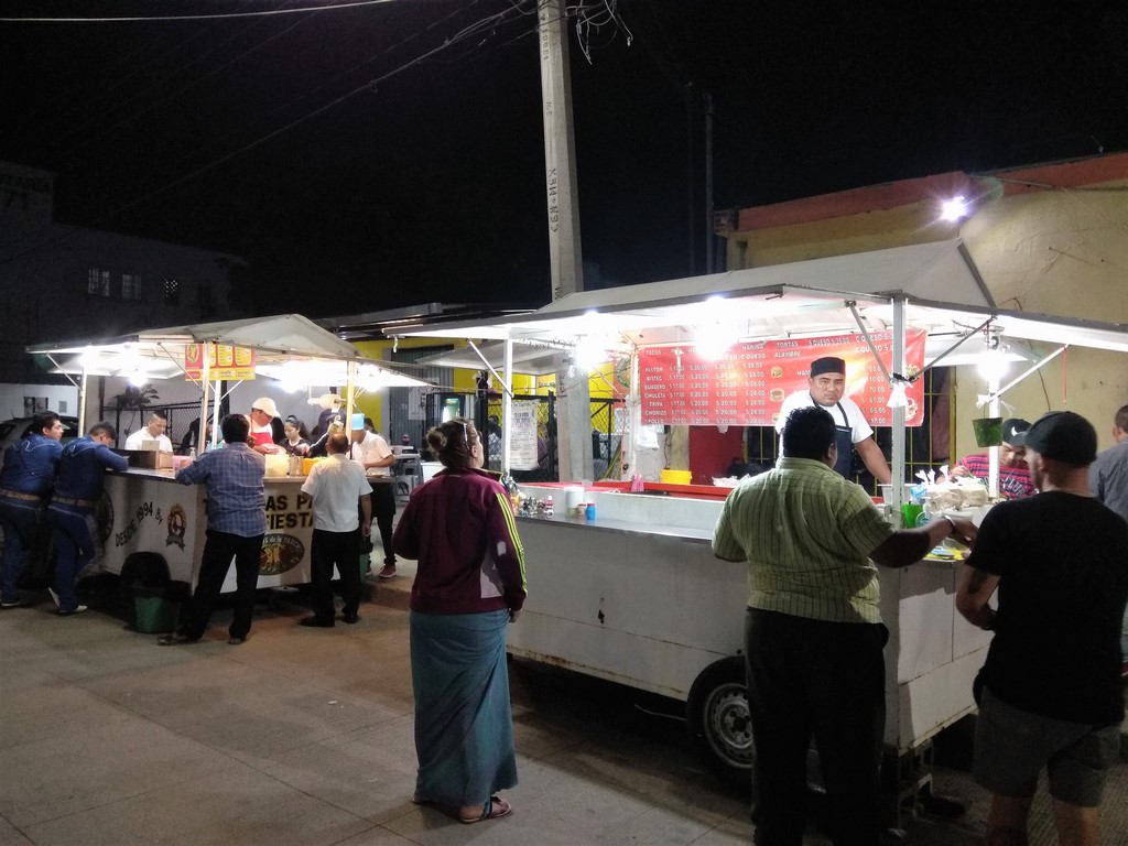 Wiele osób, które znam i podróżują, mają obiekcje dotyczące jedzenia ulicznego. My mamy dwie zasady – jemy tam, gdzie jest sporo lokalsów a jedzenie wygląda smacznie. Bardzo polecamy to miejsce! Jeśli lubicie mięsne kanapki (tortas), to bardzo polecam tortas zaraz obok przystanku lokalnych autobusów w kierunku Zona Hotelara (trzy minuty od terminala autobusowego ADO). Jadłem tam trzy lata temu i mogę tylko potwierdzić jakość 🙂