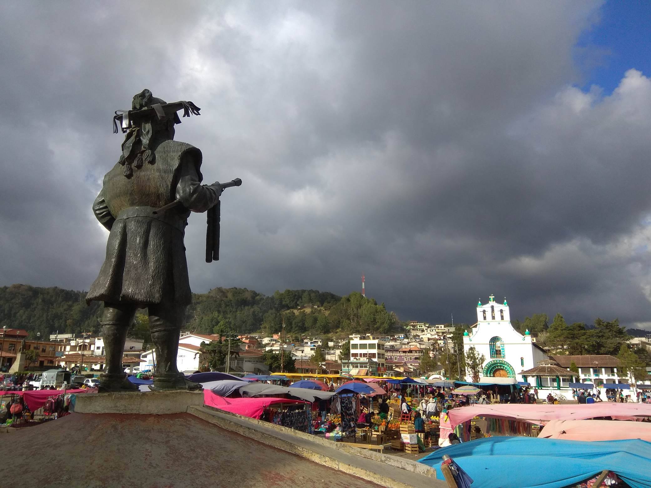 Przygoda zaczyna się już w momencie wsiadania do busika, który z San Cristobal zmierza do tej kilkutysięcznej miejscowości. Z rozmów współpasażerów nie byłem w stanie nic zrozumieć. 1/4 mieszkańców stanu Chiapas, w którym się znajdowaliśmy, stanowią Indianie. Ciągle posługują się własnymi językami. W przypadku San Juan Chamula są to Indianie z plemienia Tzotzil. Podobno 90% dzieci do 9 roku życia nie zna hiszpańskiego. 10-cio kilometrowa trasa jest bardzo malownicza, a kończy się na głównym placu miasteczka, gdzie w niedzielę króluje niepodzielnie targowisko.